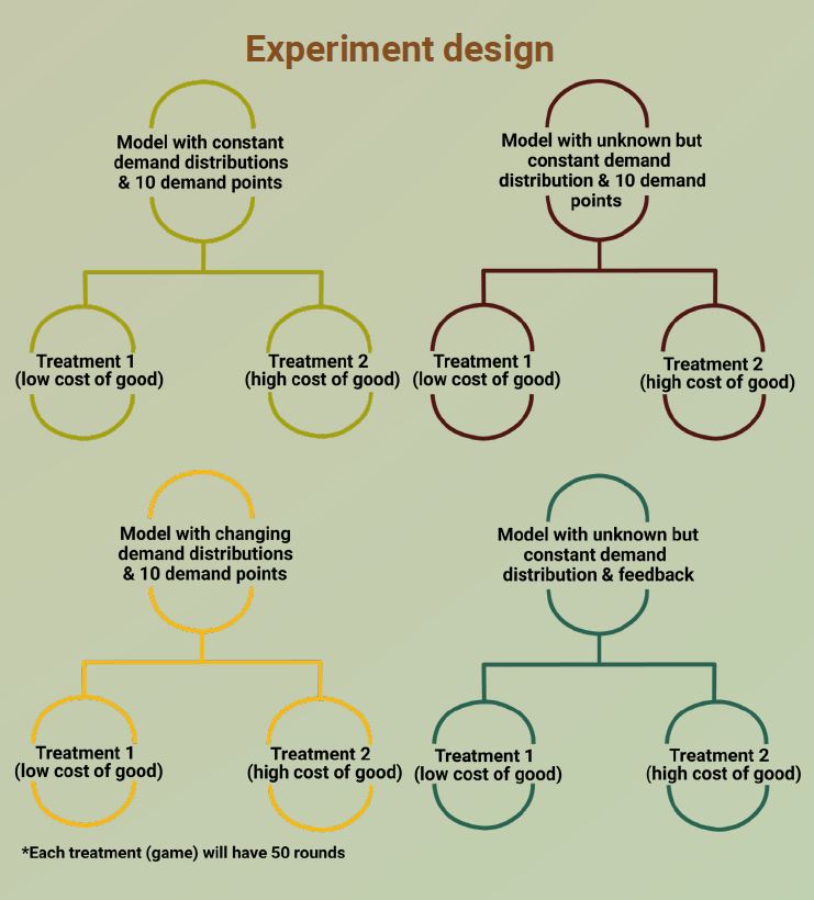 Our research question started out quite broad with simply trying to understand how people make decisions under uncertainty. Since this was our first empirical study in behavioural operations research, we began by exploring the literature, where we identified that much of the research in the area uses the newsvendor model. Further, it led us to become more interested in how people react to unknown distributions or changes in distribution. In real life, this is similar to an inventory manager not having enough data to forecast demand or needing to make decisions about multiple, heterogeneous products. We were also curious as to whether people would be able to learn or adapt their knowledge as they received more feedback. Thus, our research questions became: how do people respond to changes in distribution, and how close are people in finding the optimal quantity with limited demand information?